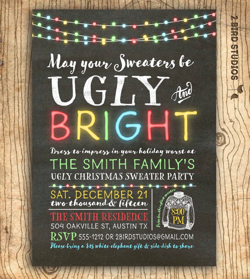 And if the sweaters came from a thrift shop your invitations can be almost as competitively priced with our free ugly sweater party invitations. You either pay a designer a small fee to personalize an invitation for you or pay a small fee for an editable invitation template you edit and print yourself. Join the ugly christmas sweater party on 20 th december year at location time onwards.